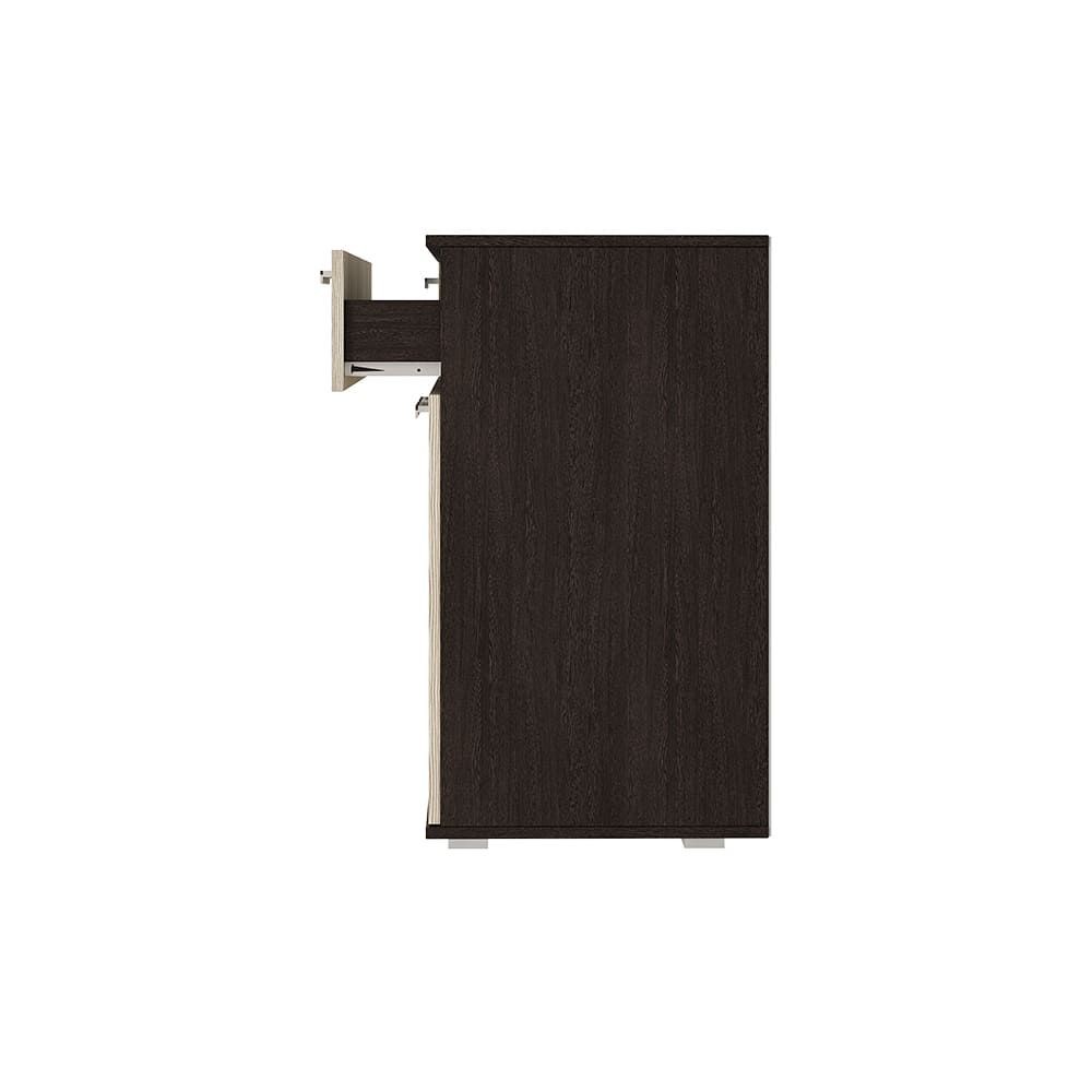 - модель состоит из трех секций: верхнего выдвижного ящика, левой части с распашной дверцей и нижней секции также с распашными дверцами и спрятанными за ними полками,