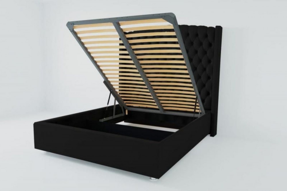 - Короб для белья установлен в нижней половине кровати, ее верхнюю половину занимает подъемный механизм.