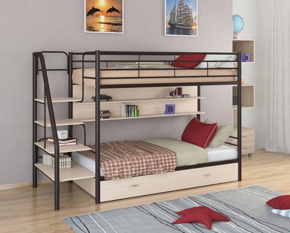 Материал каркаса: стальная труба. Все металлические элементы кровати покрыты износоустойчивой полимерной порошковой краской без запаха. Ступени лестницы, полка и ящик - из ЛДСП. Двухъярусную кровать можно собирать и разбирать неограниченное количество раз, и от этого она не потеряет в прочности и качестве. Гарантия производителя: 18 мес.