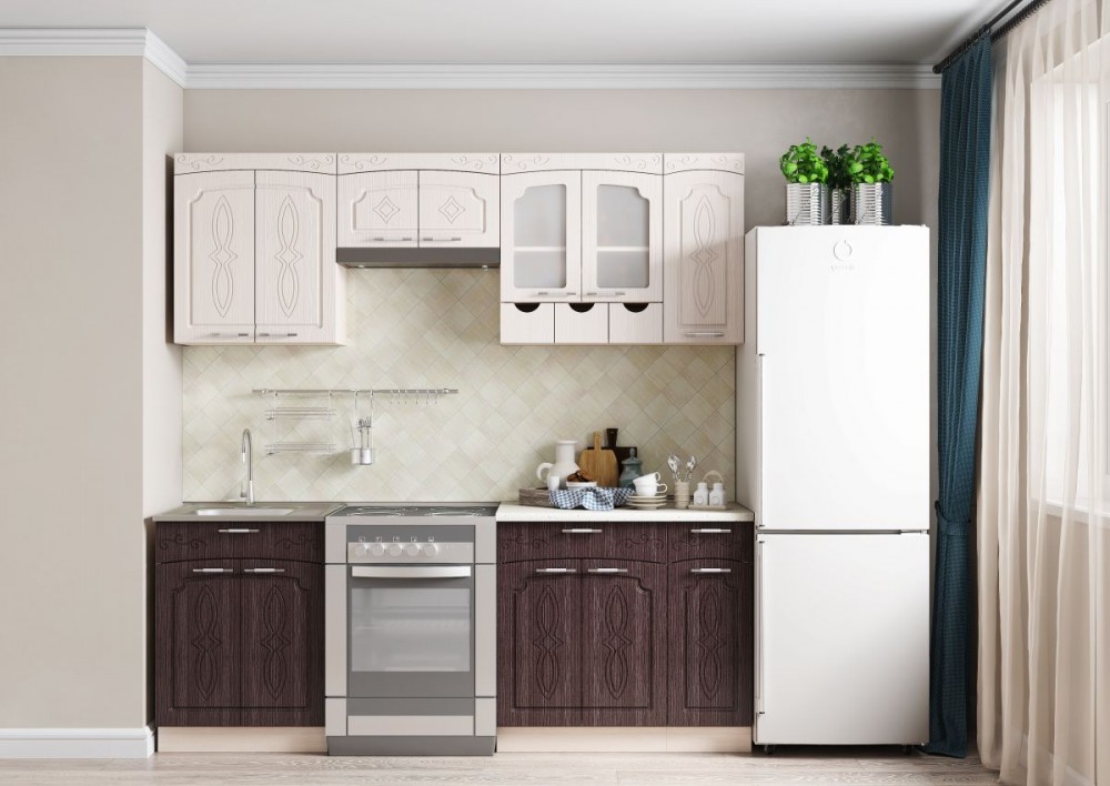 Вместить все необходимое для приготовления различных блюд и хранения посуды может наш компактный кухонный гарнитур для маленькой кухни Легенда 4 длиной в 1,5 метра. Каждая его секция оснащена несколькими функциональными отделами. Например, в навесном шкафу мы оборудовали три специальных небольших ящика для различных приправ и специй. Особый шарм гарнитуру придают резные дверцы и сочетание древесных оттенков – венге и выбеленного дуба, что делает наш гарнитур украшением любой кухни.
