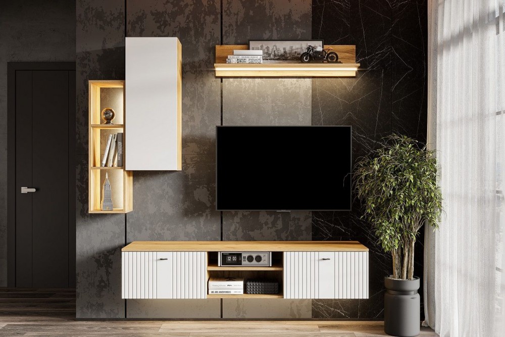 Модульная гостиная «Милан» Белая — это невероятное сочетание ЛДСП в цвете Дуб Золотой и Белого матового МДФ. Безупречная фрезеровка фасадов подчёркивает мягкую матовую текстуру, а сама гостиная выглядит ярко и контрастно. Всё это позволяет сделать дизайн гостиной уникальным и запоминающимся.