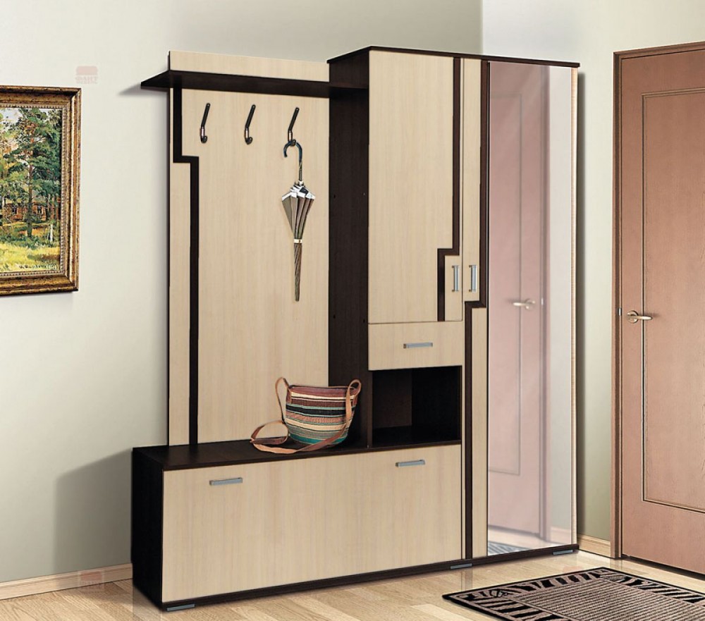 Прихожая компактна, занимает немного места. Прихожая содержит все элементы, необходимые для создания комфорта во входной зоне.