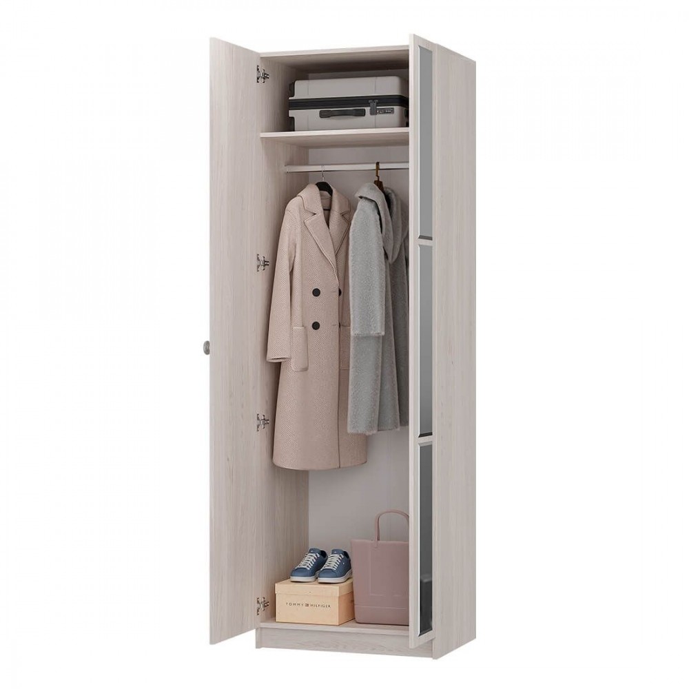 Шкаф "Зарина" имеет две распашные створки: на одной наклеены 3 зеркала с фацетом, вторая створка глухая.
