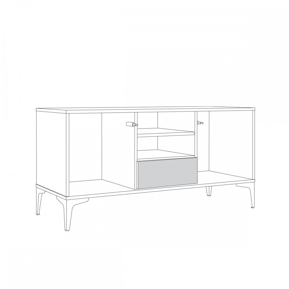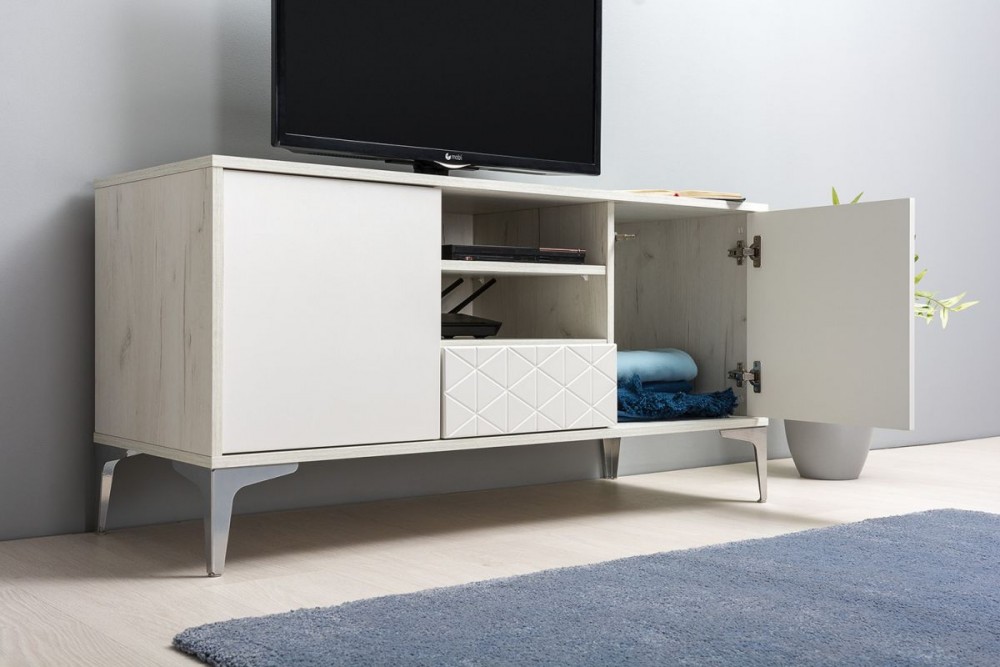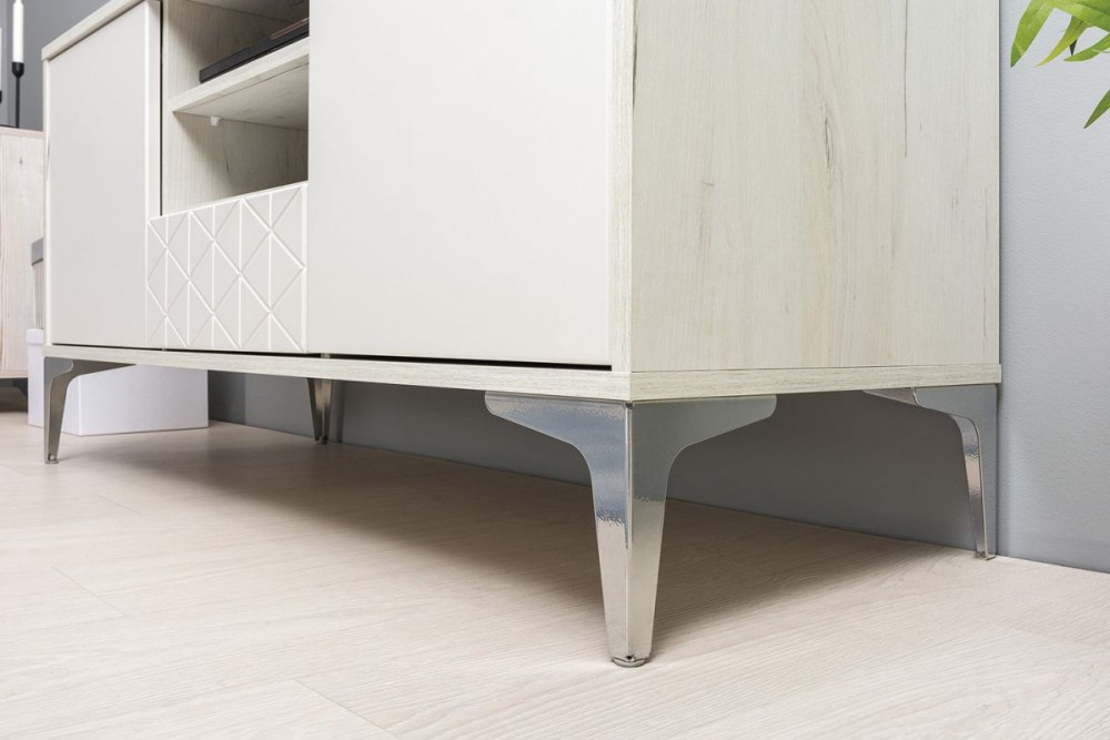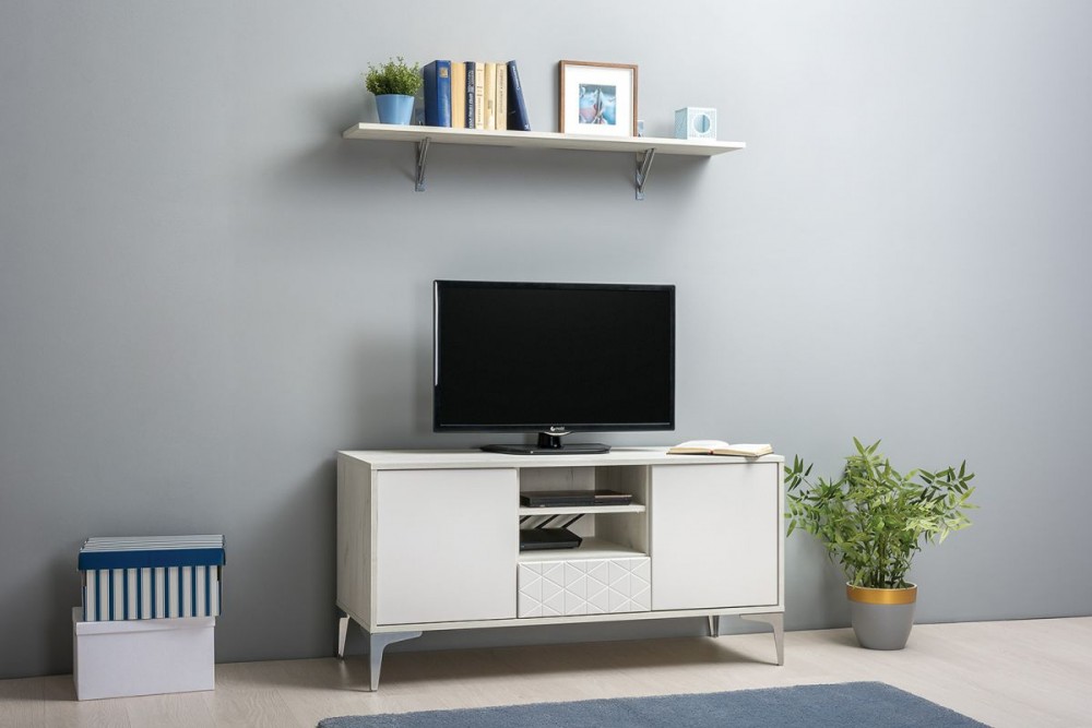Лаконичное светлое решение, состоит из двух модулей. Тумба обладает большой вместимостью и функциональностью, удобно расположены ниши для мультимедиа техники.