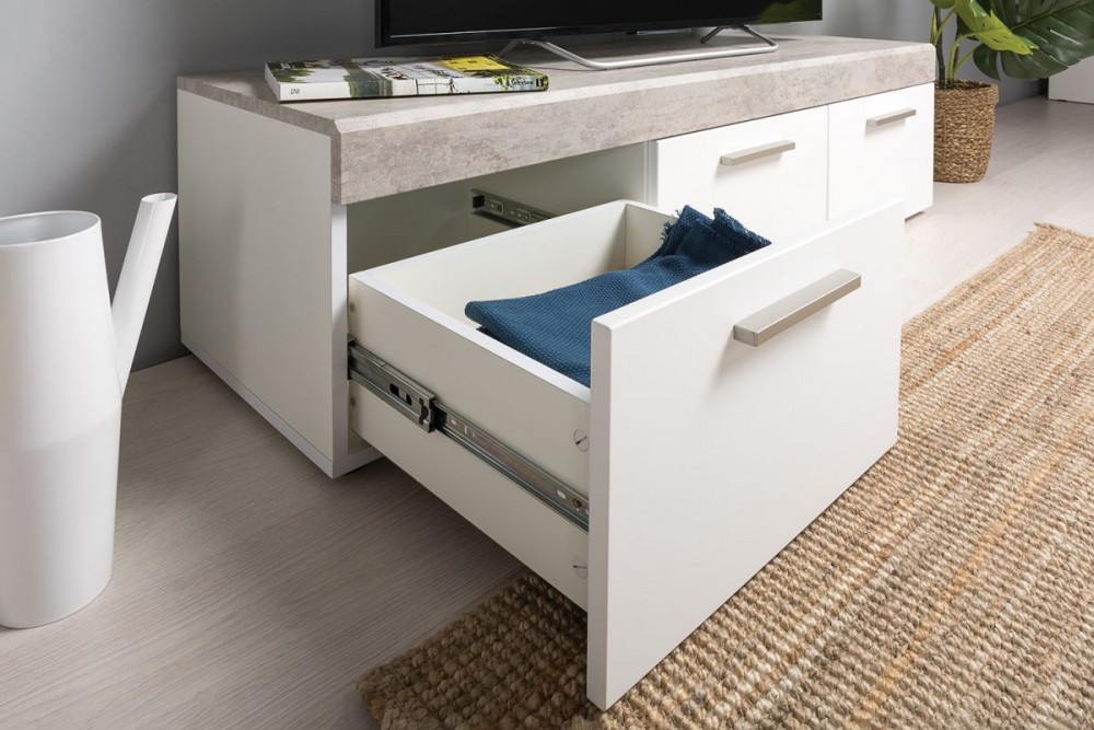 Вместительность тумбы обеспечивается тремя выдвижными ящиками на шариковых направляющих полного выдвижения.