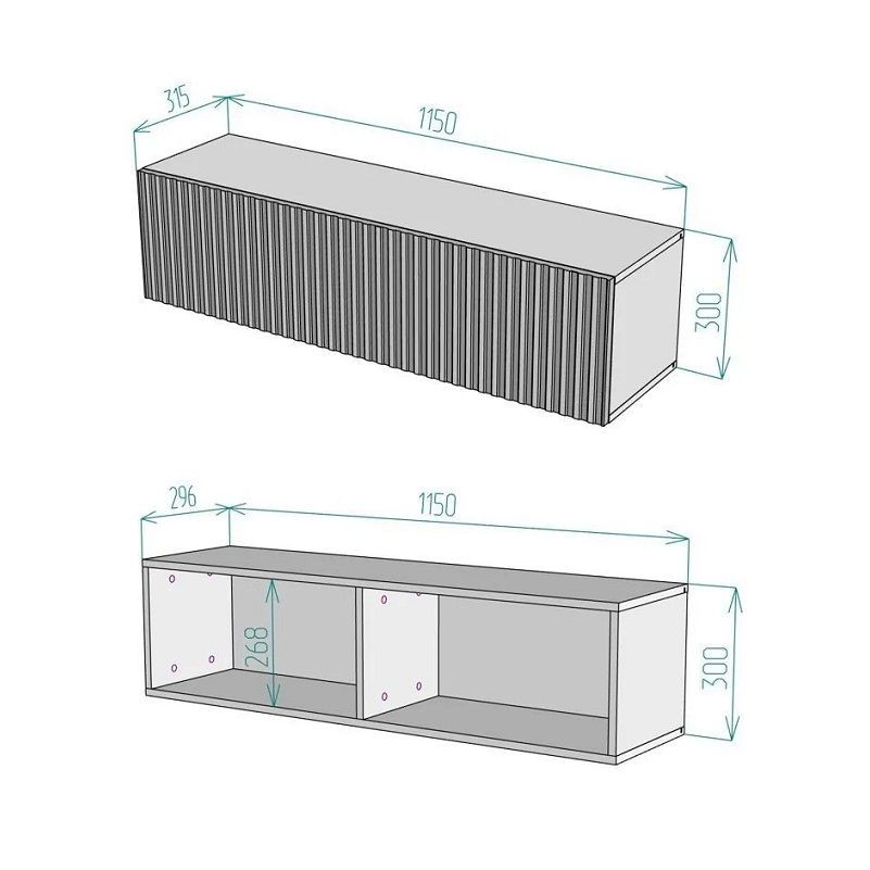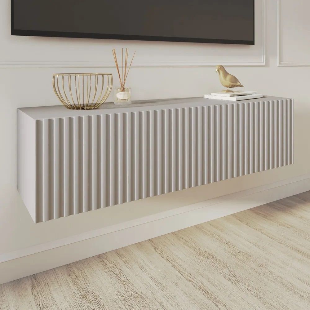 Благодаря своей компактности тумба под ТВ подвесная поможет сэкономить пространство, избежать ощущения загромождённости гостиной, спальни или детской комнаты, а рифлёный фасад будет акцентировать