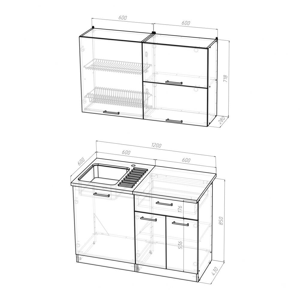 Ширина: 1200 мм; Глубина: 600 мм (со столешницей)