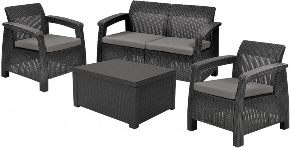 Corfu box - это элегантный мебельный гарнитур с фактурой, напоминающей ротанг, который состоит из двух кресел, двухместного дивана и столика-сундука. Продукт оснащён мягкими подушками сидений. В столе-сундуке всегда можно спрятать вещи от дождя. Мебель с легкой и одновременно устойчивой конструкцией красиво впишется в любое приусадебное пространство, такое как сад или терраса. Набор очень легко чистится. Изготовлен из стойкого к воздействию УФ-излучения пластмассы.