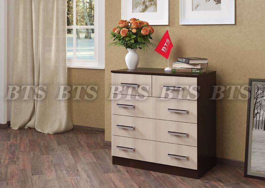 Практичный, компактный и функциональный комод «Стандарт 5» состоит из пяти выдвижных ящиков различной вместимости. Модель оборудована тремя большими и двумя ящиками меньшего размера. Оригинальность этой модели придает разделенный на две равные части верхний ящик. Поверхность комода можно использовать в качестве подставки под телевизор, или украсить декором.