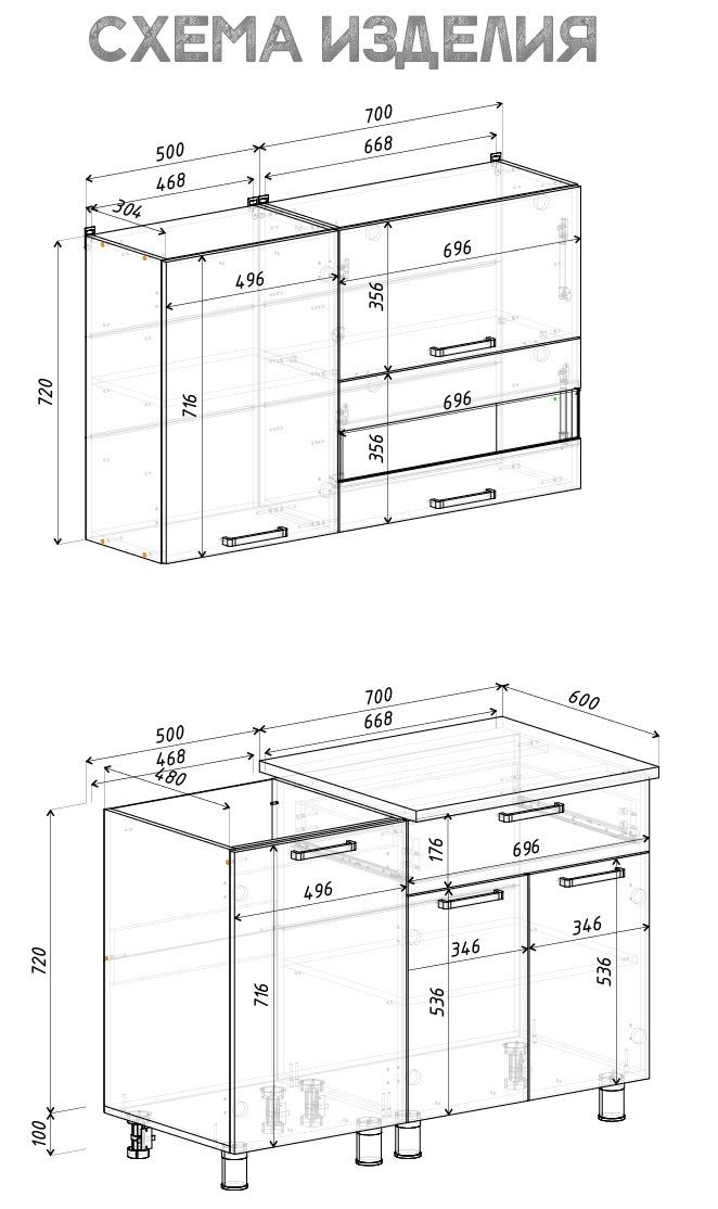 Габаритные размеры композиции нижних модулей с учётом столешницы: ширина - 1200 мм, высота - 846 мм, глубина - 595 мм.