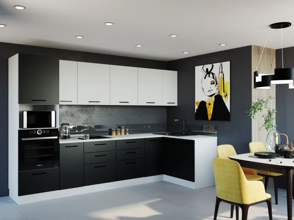 - Столешницы цельные со скруглением по переднему краю, пластиковым покрытием и силиконовый каплесборник (защищает фасады нижних модулей от попадания влаги и разбухания);