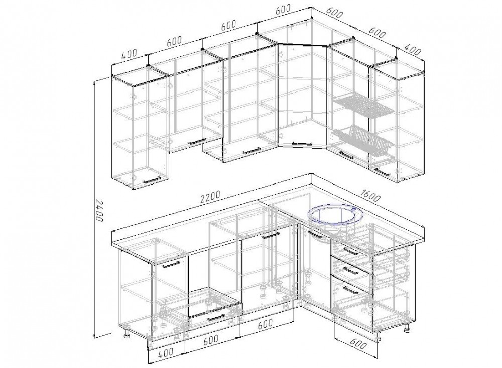 Фасады верхних модулей со свесом 12 мм дают возможность использовать без установки ручек.