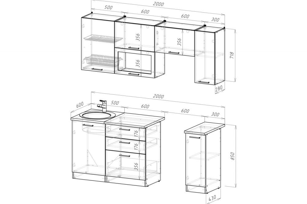 Ширина: 2000 мм; Глубина: 600 мм (со столешницей)