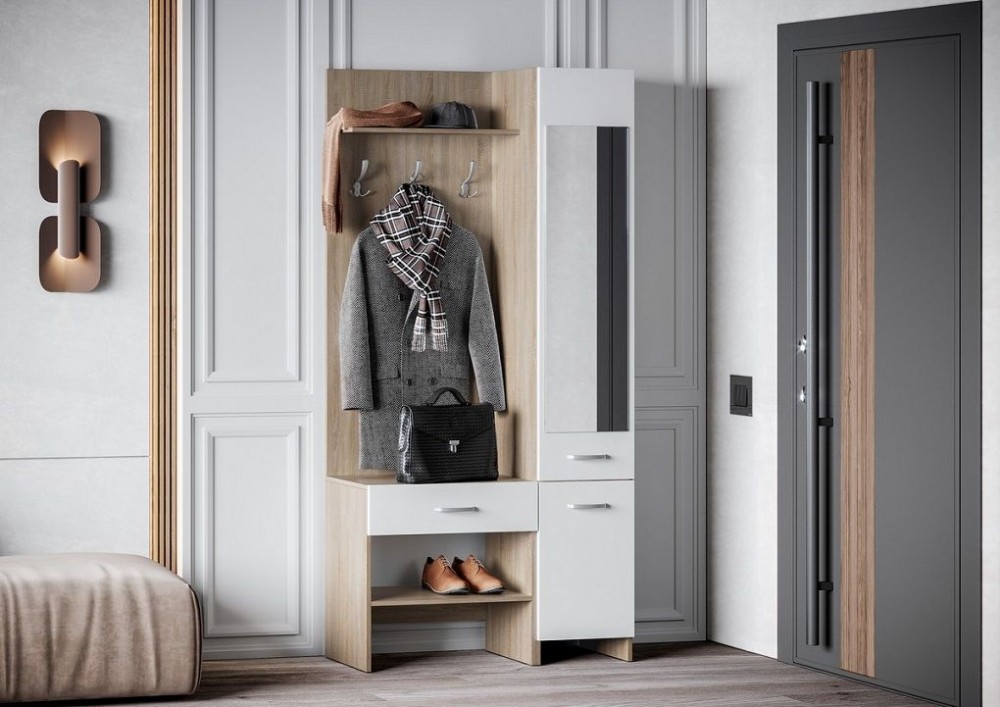 Прихожая компактна, занимает немного места. Прихожая содержит все элементы, необходимые для создания комфорта во входной зоне.