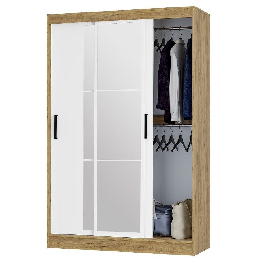 Трёхдверный шкаф-купе "Тайм" представляет собой сочетание практичности и функциональности. Это оптимальный вариант с точки зрения эргономики пространства. Раздвижные створки снабжены удобными ручками, центральная створка полностью декорирована зеркалом с еврокромкой, которое создаёт иллюзию расширенного пространства. Внутри с одной стороны находятся пять просторных полок для хранения вещей и постельного белья, с другой стороны – вместительная зона хранения с двумя горизонтальной хромированной штангой для одежды на вешалках. Все три створки шкафа подвижны.