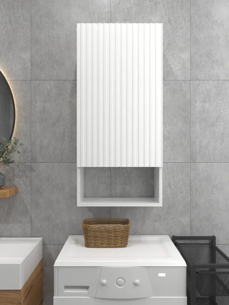 Белый шкаф с рифлёным фасадом будет отлично и стильно смотреться как в ванной, так и в туалете.