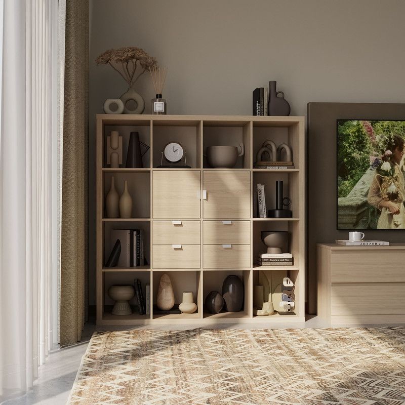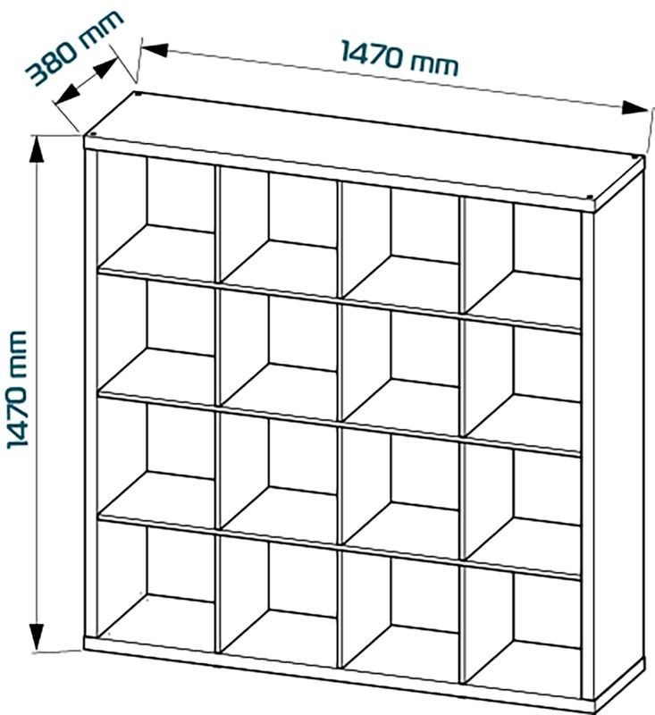 Стеллаж Фора 16, широкий стеллаж с шестнадцатью открытыми ячейками, 1470х1470х380, цвет Дуб Беленый. Конструкция рамы - тамбурат (рамка из ДСП и HDF с сотовым заполнением) - популярная современная технология, активно внедряемая крупнейшими производителями для изготовления мебели по скандинавским стандартам. Преимущества стеллажа, такие, как: облегченная конструкция (тамбурат); высокая прочность; простая сборка; эстетичный внешний вид; возможность установки дополнительных аксессуаров, - открывают возможность широкого применения стеллажа в интерьере в стиле сканди, минимализма. Гарантийный срок для жилых и общественных помещений 24 месяца.