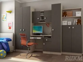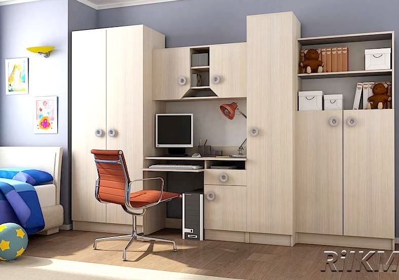 Функциональная детская стенка. Шкаф для одежды, рабочий стол с тумбой, шкафчик для книг и других нужных мелочей в детской - все это совмещено в одном комплекте мебели. Выполнена из качественной ЛДСП. Используется кромка ПВХ в цвет ЛДСП 0,4 мм.