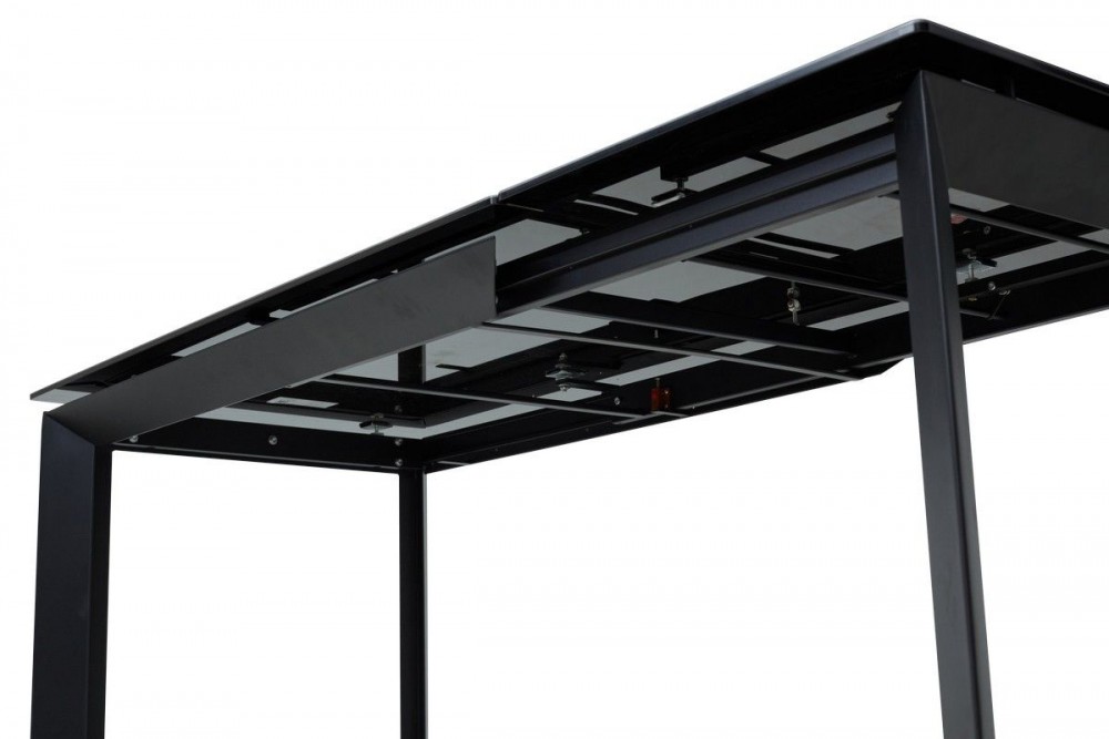 • основание стола - металл, цвет - черный, ножки стола расположены по углам столешницы под углом;