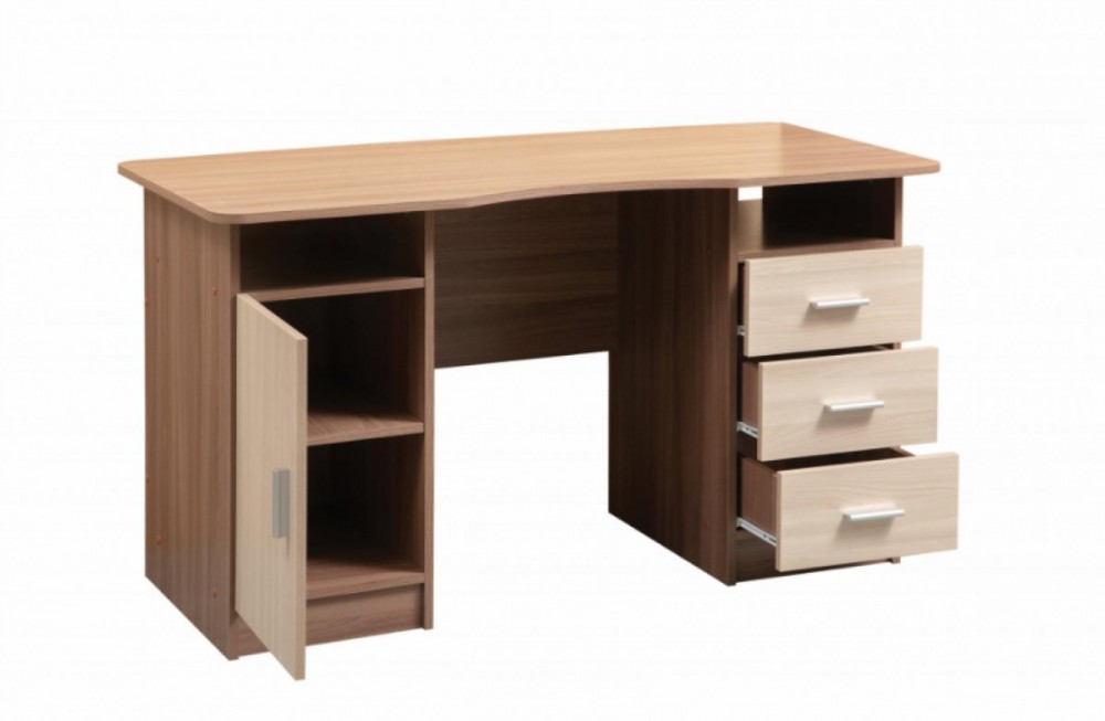 Рабочая поверхность имеет большую площадь, эстетике изделия способствуют скруглённые углы. Слева расположена секция, скрытая за глухой дверцей. Справа размещены три выдвижных ящика. По бокам выполнены полые ниши, обеспечивающие удобство расположения часто используемых предметов.
